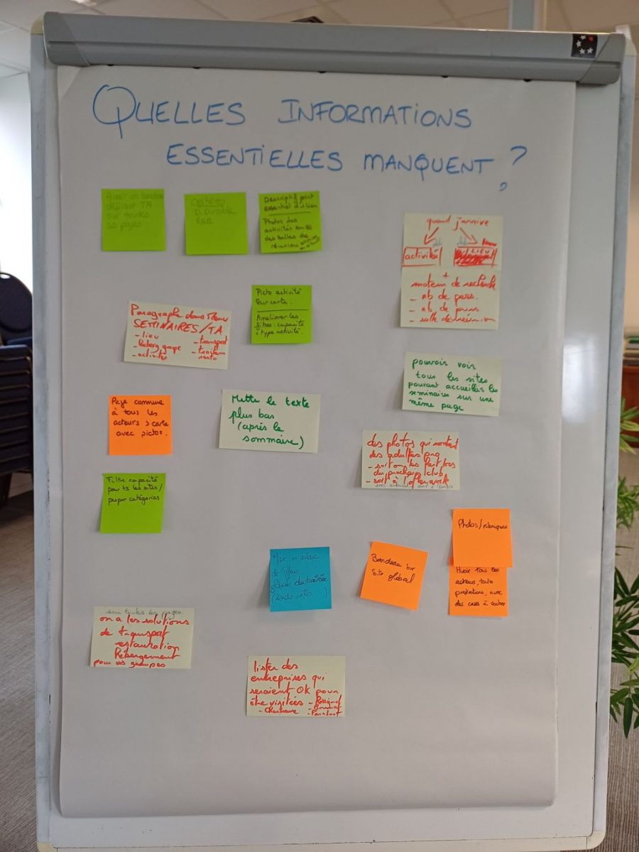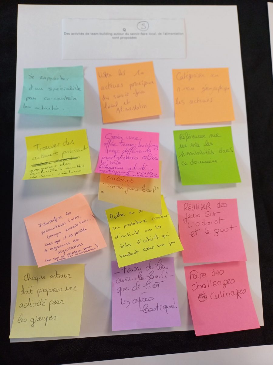 - Reprise des idées pépites qui étaient ressorties lors de l’atelier 2 et explications de l’abandon de certaines idées car non réalisables pour des raisons de budget, de RH, de compétence tourisme